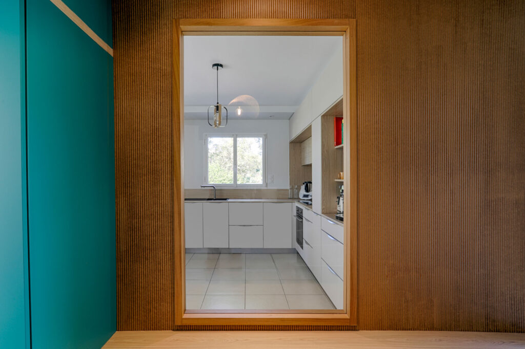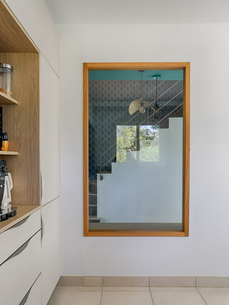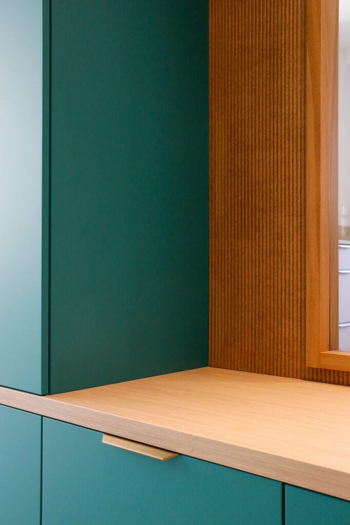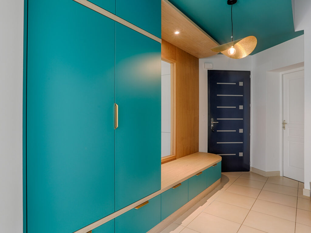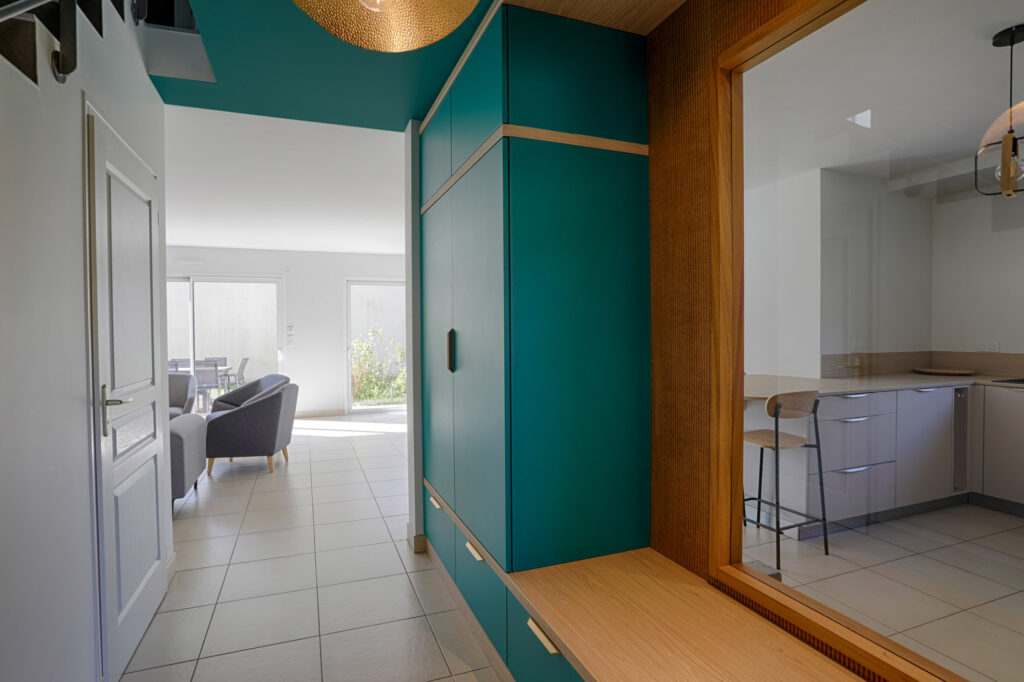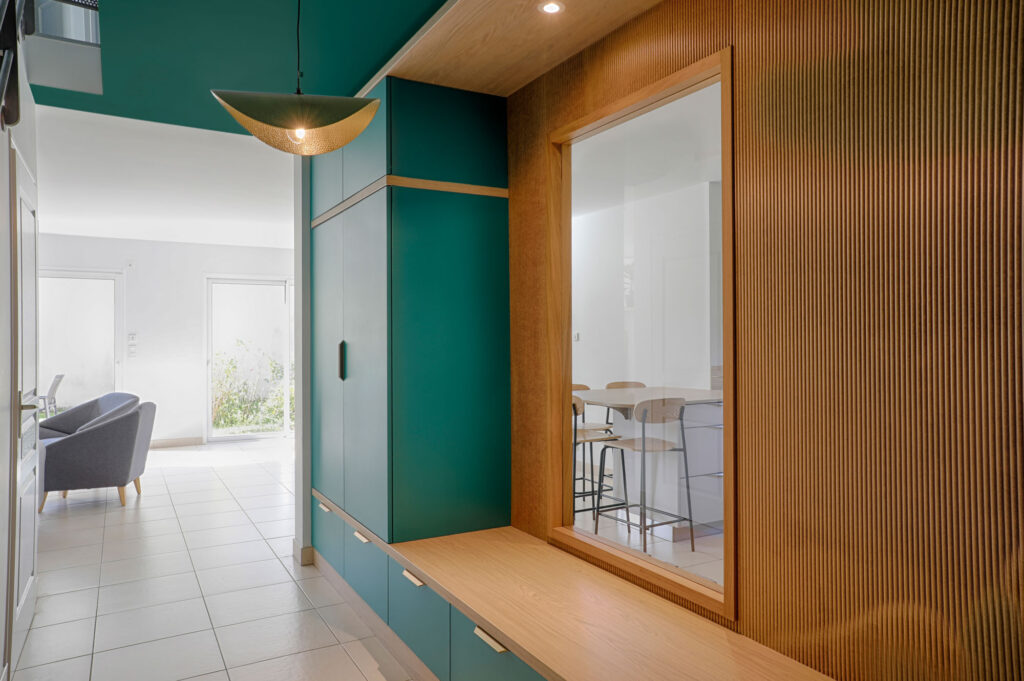 L’entrée a été repensée avec un agencement sur mesure intégrant rangements pour manteaux et chaussures, ainsi qu’un banc accueillant. Une fenêtre intérieure a été créée pour apporter davantage de lumière naturelle. Le mélange du bois naturel et de la couleur apporte chaleur et modernité.