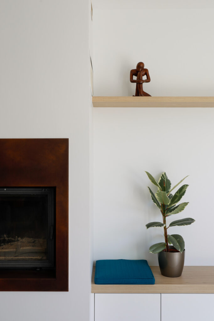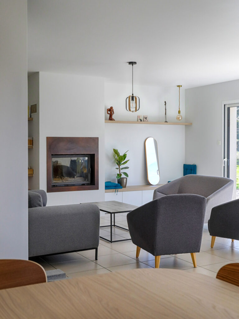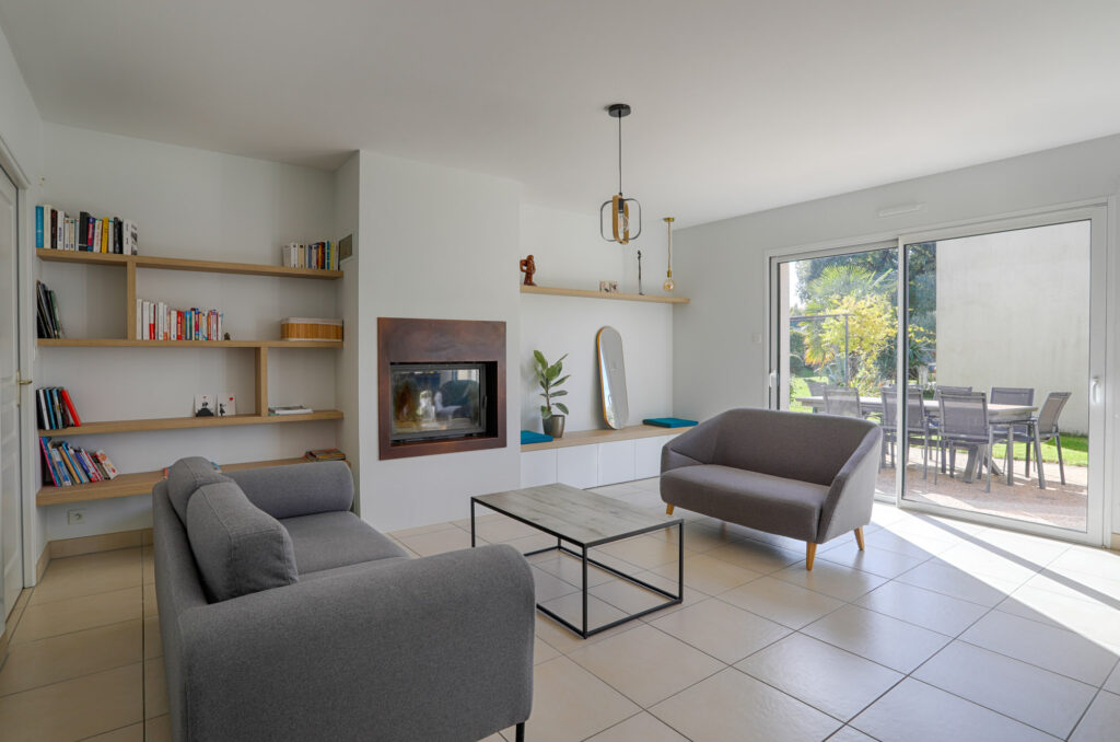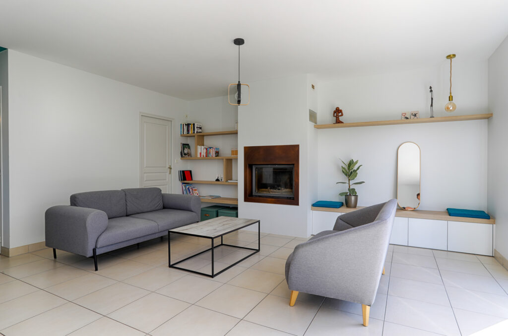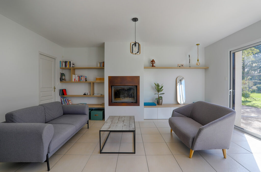 Dans le salon, un coin banquette autour de la cheminée a été imaginé, accompagné de tablettes servant de bibliothèque, pour créer un espace de détente convivial et harmonieux.