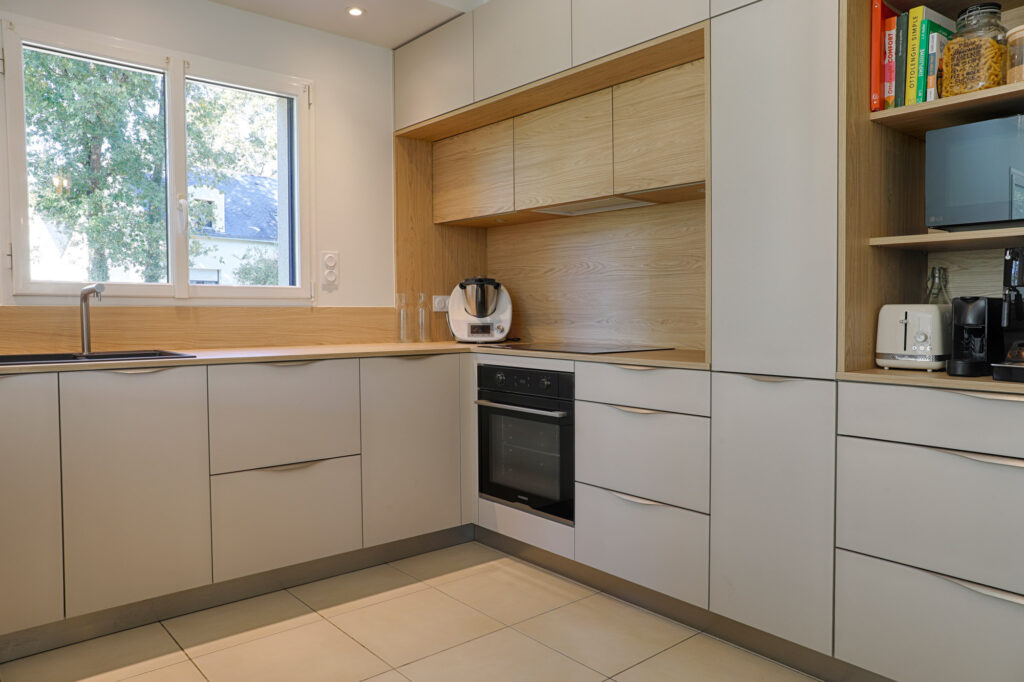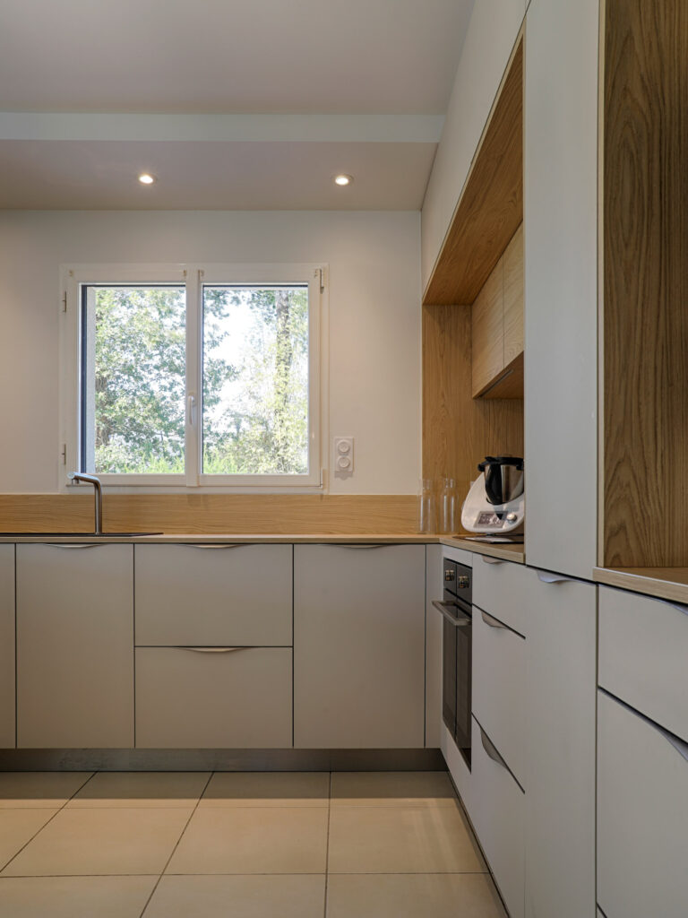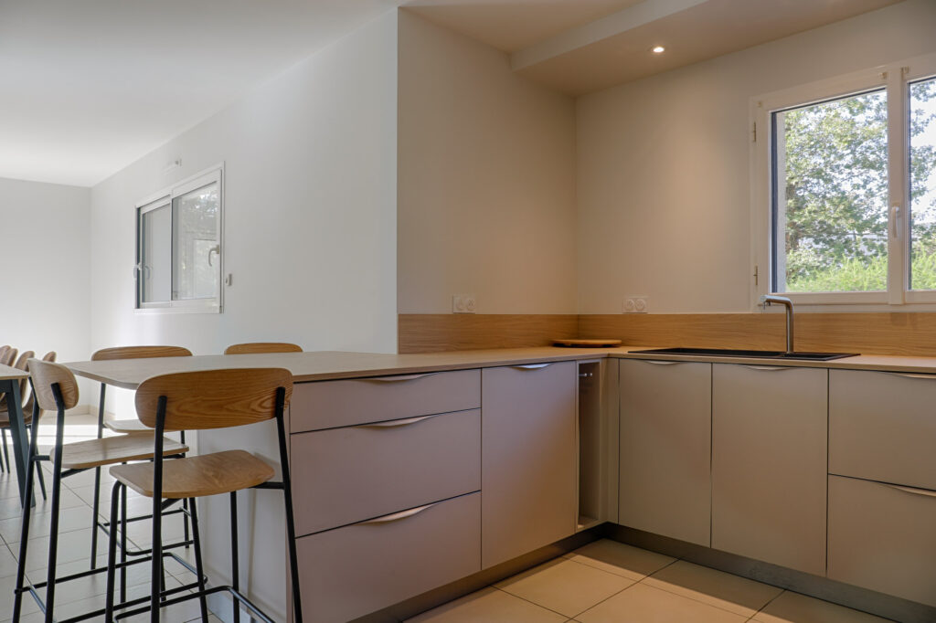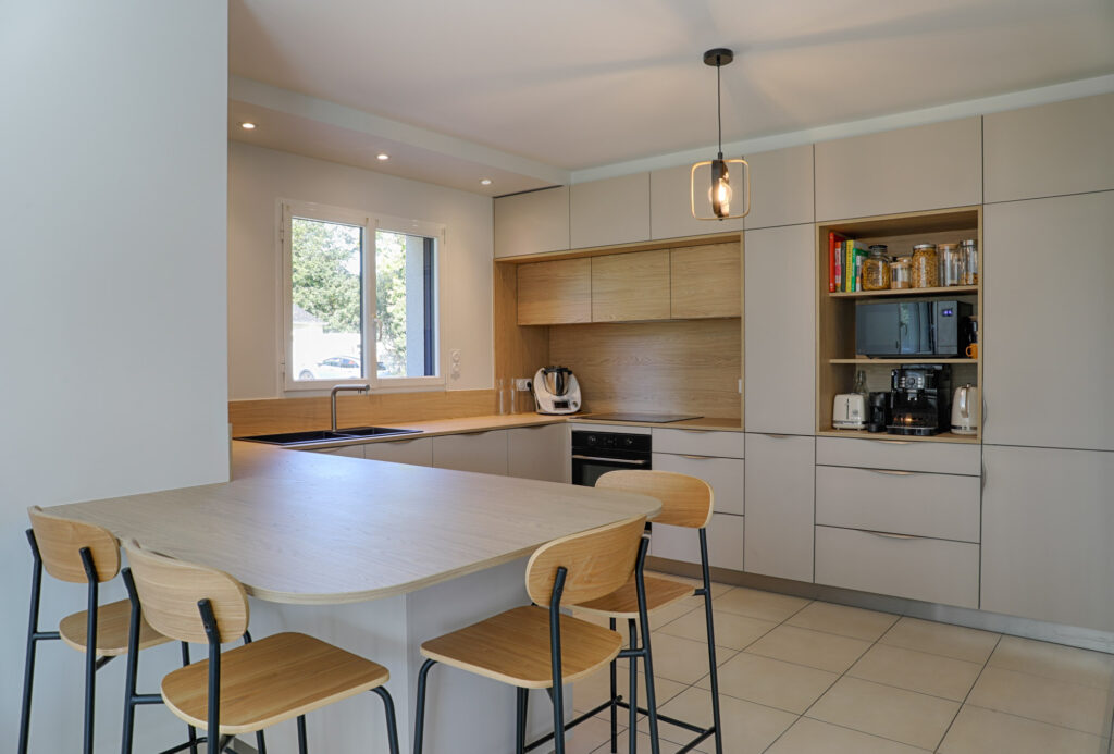 La cuisine a été entièrement réorganisée avec des matériaux chaleureux, un coin petit déjeuner, de nombreux plans de travail et un espace repas du quotidien.