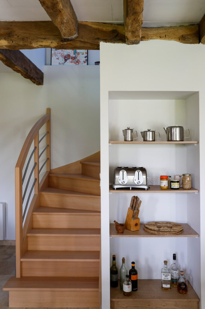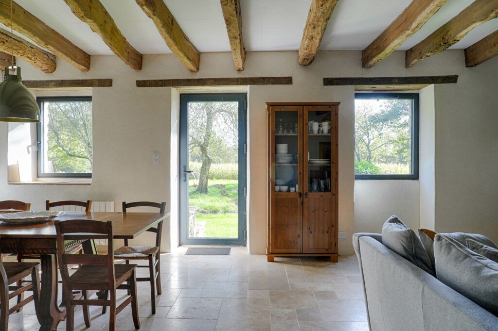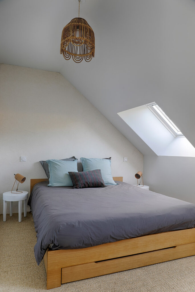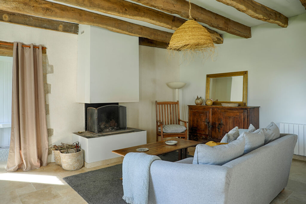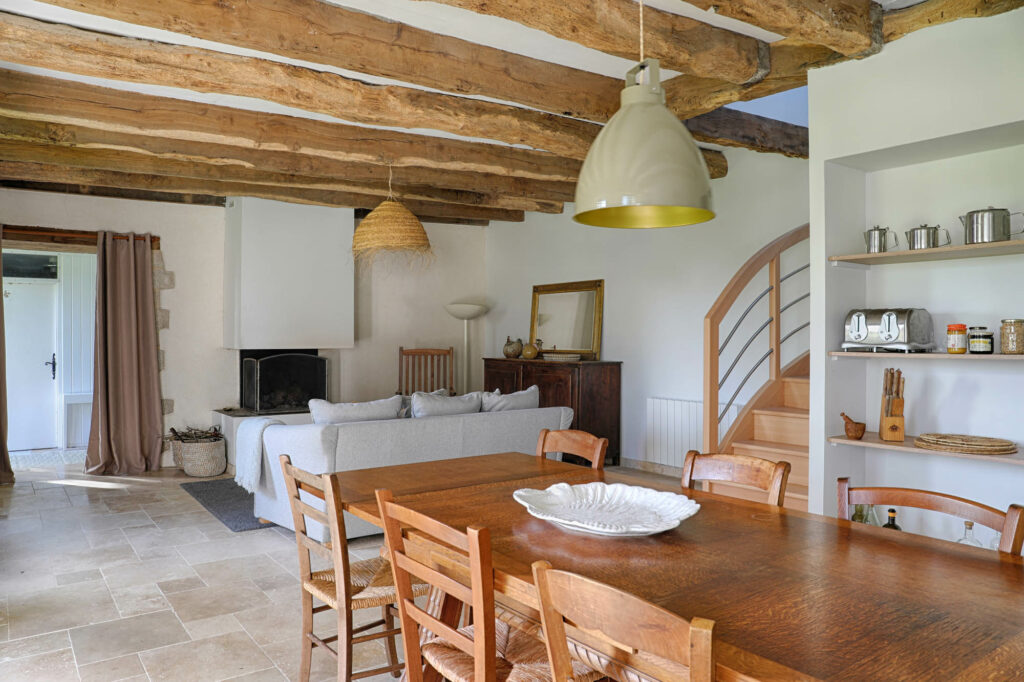 Les poutres apparentes ont été conservées et mises en valeur, soulignant le charme rustique du lieu. Le mobilier en bois massif et les teintes naturelles renforcent cette atmosphère douce et intemporelle.