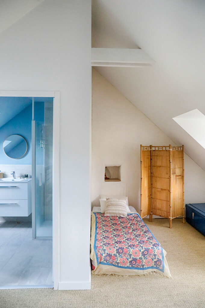 Les murs ont été isolés avec un enduit chaux-chanvre ou avec de la laine de bois, matériaux respirants et respectueux du support d’origine. Le sol a été entièrement refait en travertin, une pierre naturelle qui apporte chaleur et authenticité à la pièce.